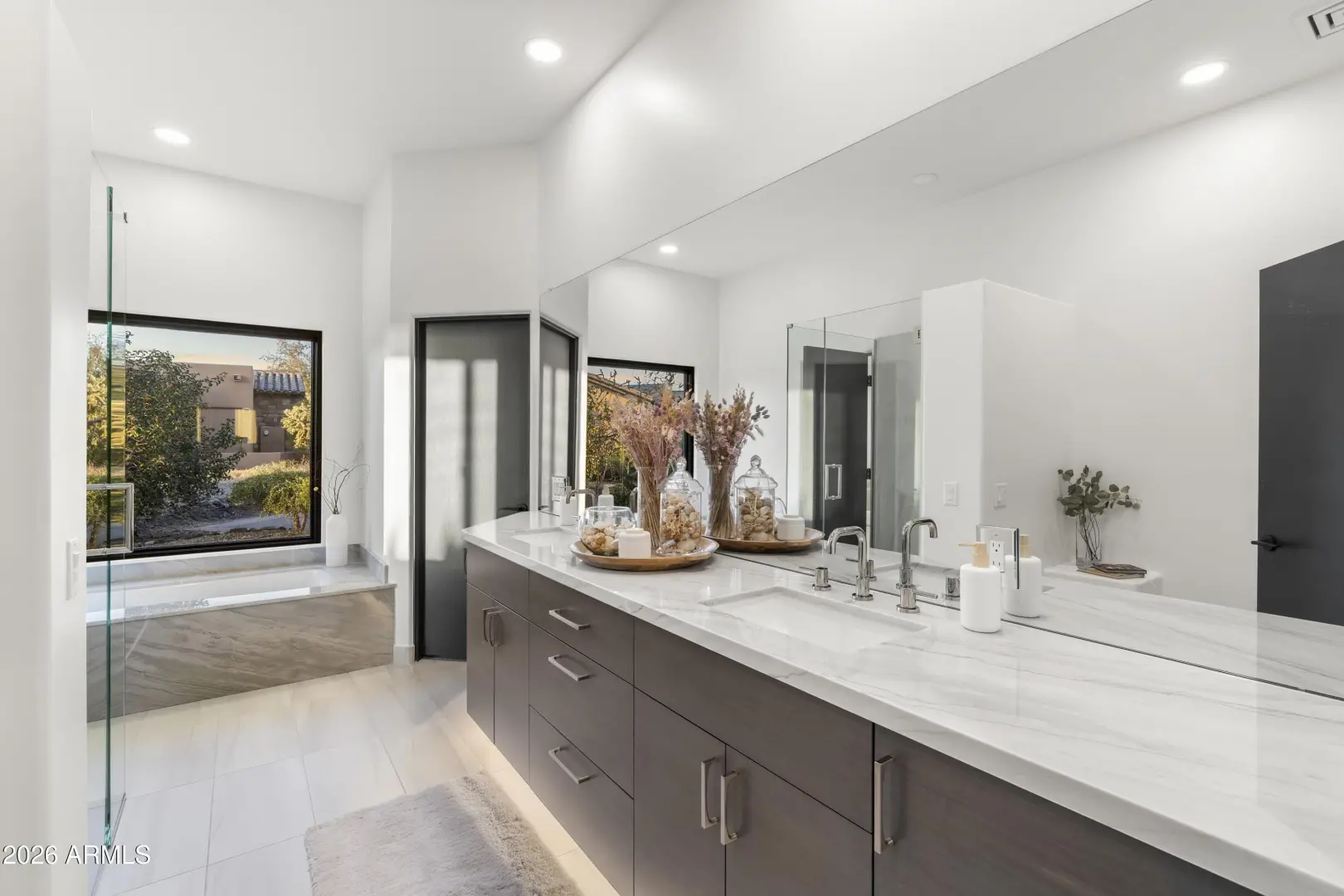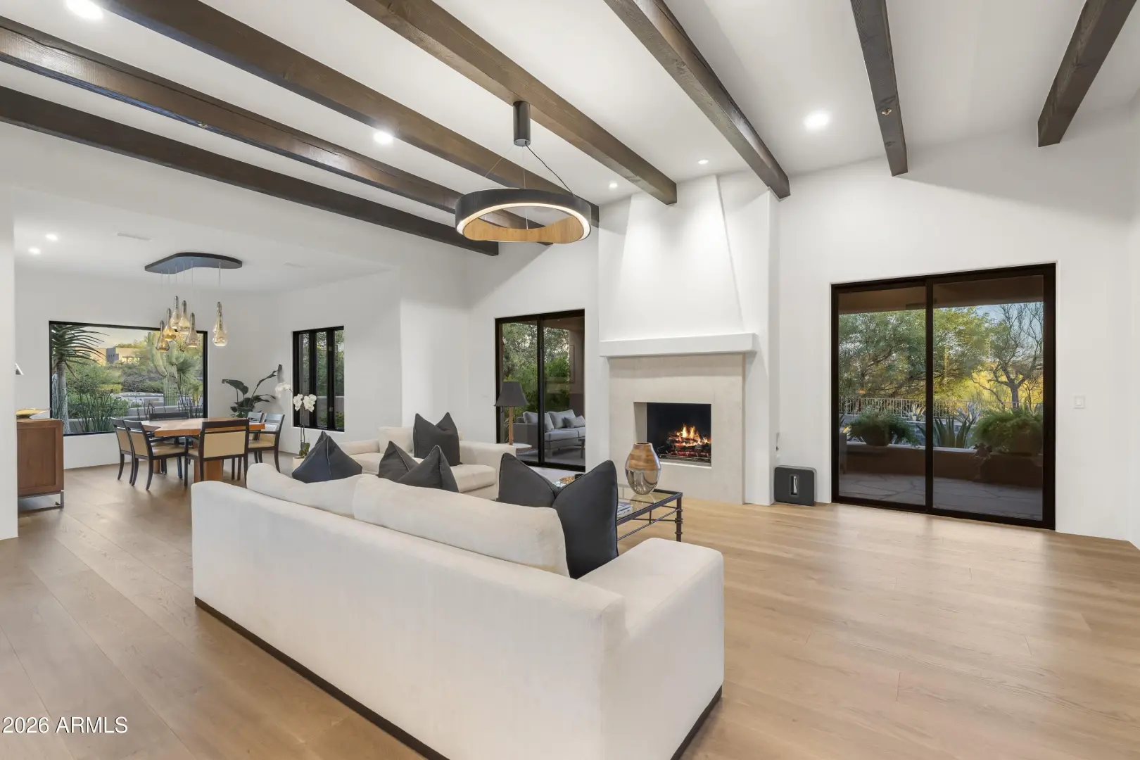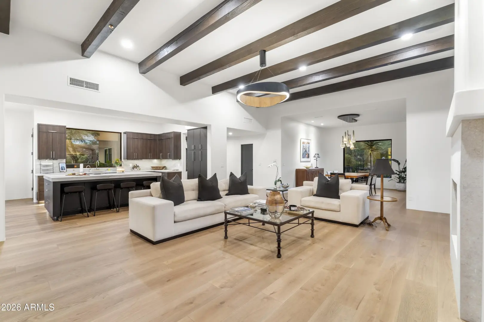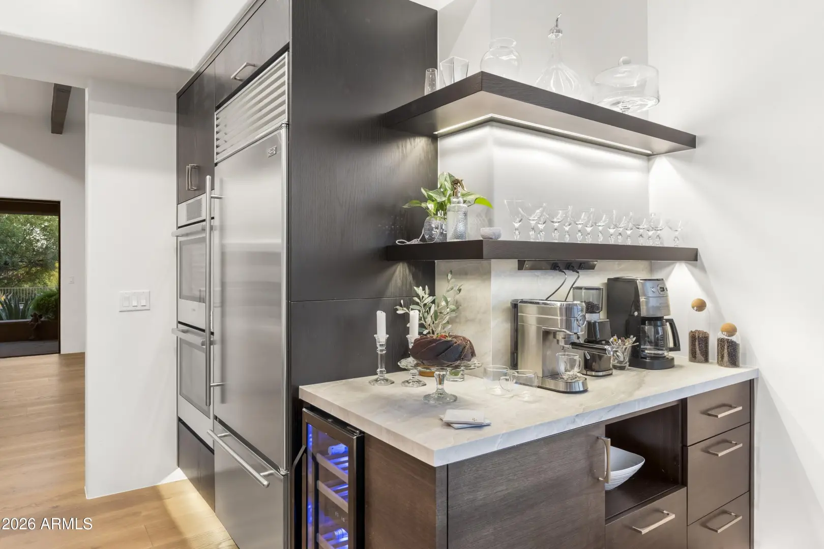 Complete Remodel in 2025-2026. NO interior steps. Light and bright interiors spaces with a great room floor plan. This home has been reimagined into a modern open-concept design. The chef's kitchen was completely redesigned and features an impressive 8-by-5-foot island with porcelain countertops and book-matched backsplash, custom hand-crafted walnut cabinetry with soft-close pull-out drawers, under-cabinet and toe-kick lighting, & a dedicated coffee bar with shelving and lighting. A wall pantry with shallow shelving and built-in electrical outlets provides convenient storage for small appliances. The kitchen is equipped with Bosch double ovens, a Bosch five-burner induction cooktop, and polished nickel fixtures. The primary suite offers hardwood flooring, a limestone gas fireplace, and