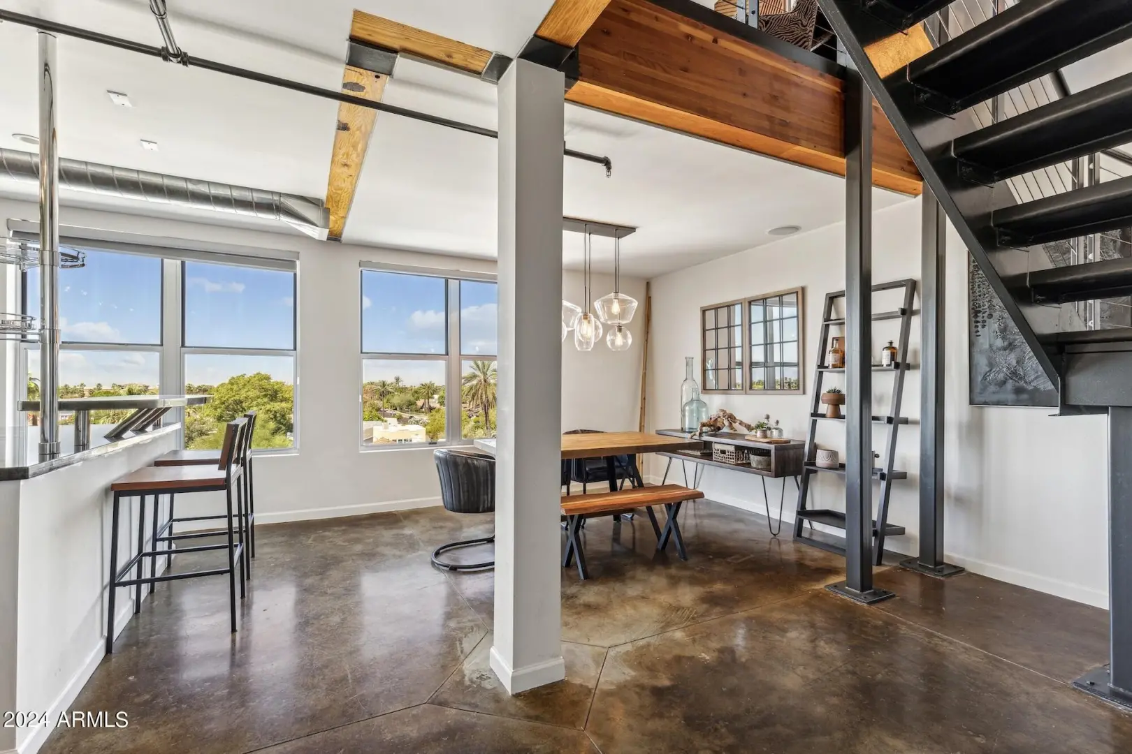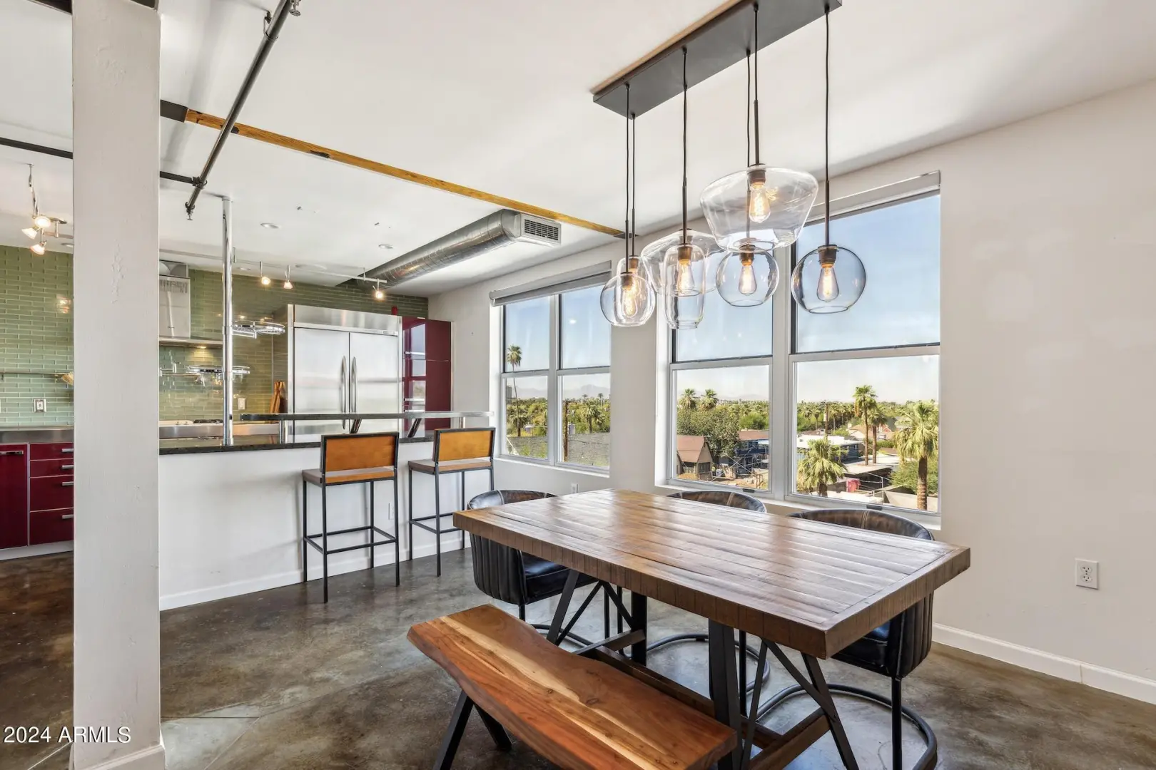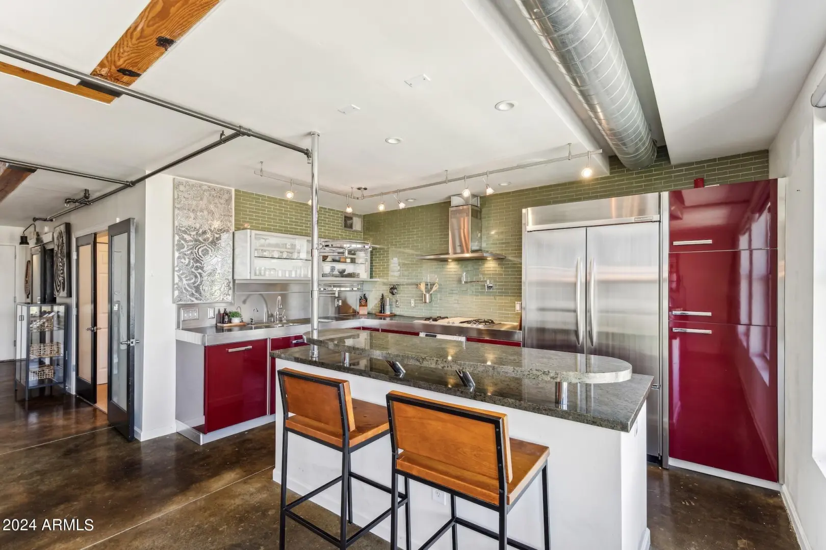 Price reflects a 12-month lease, please inquire about alternative pricing if desired length is more or less than 12 months. Prepare to be blown away as you step inside this incredible, multi-level loft that encompasses a chic modern/industrial charm around every corner. Polished concrete floors, soaring ceilings and a bold black metal staircase are just a few of the standout features in this property. The living area includes a built-in Sonos system as well as a beautiful custom art piece that truly accentuates the space. The European style kitchen has Gaggenau stainless steel appliances (with a built-in grill) and sleek red cabinetry. The adjacent dining area, with its modern lighting from Crate and Barrel, offers expansive west-facing views—perfect for watching the sunset.