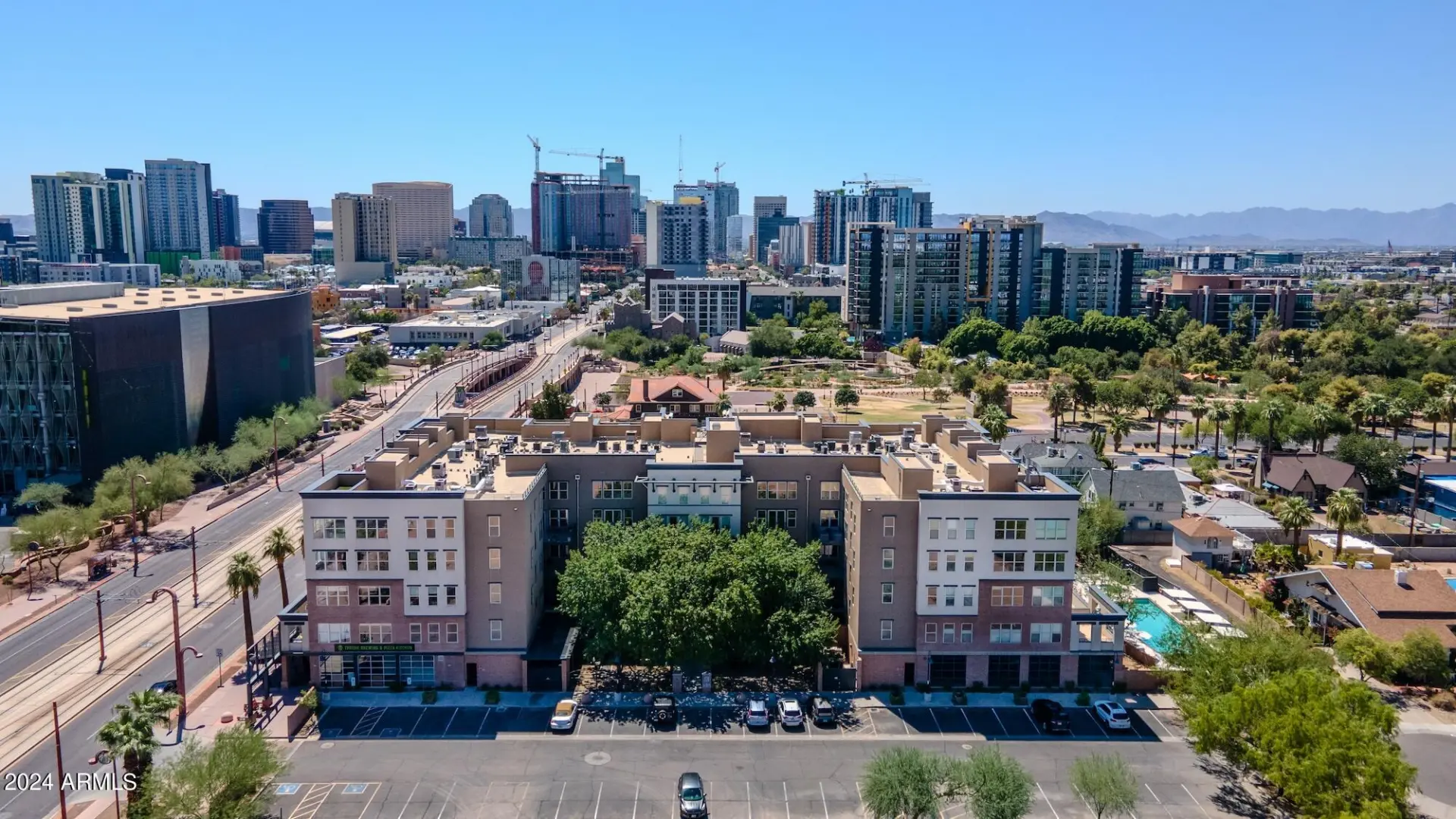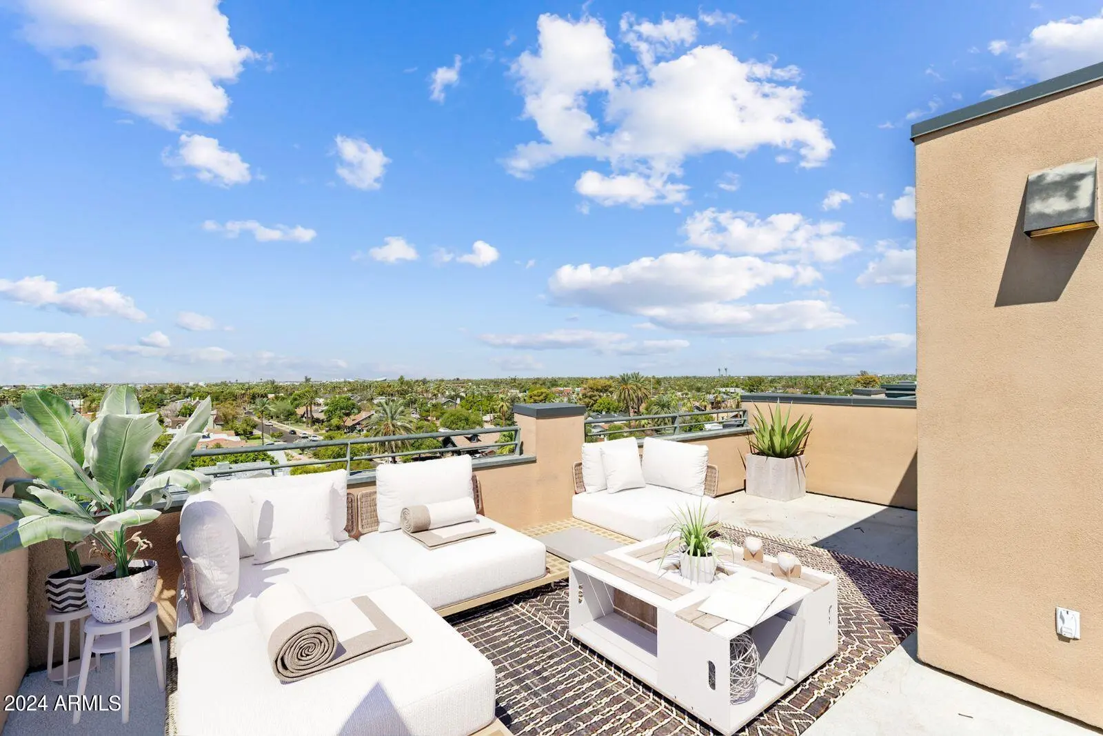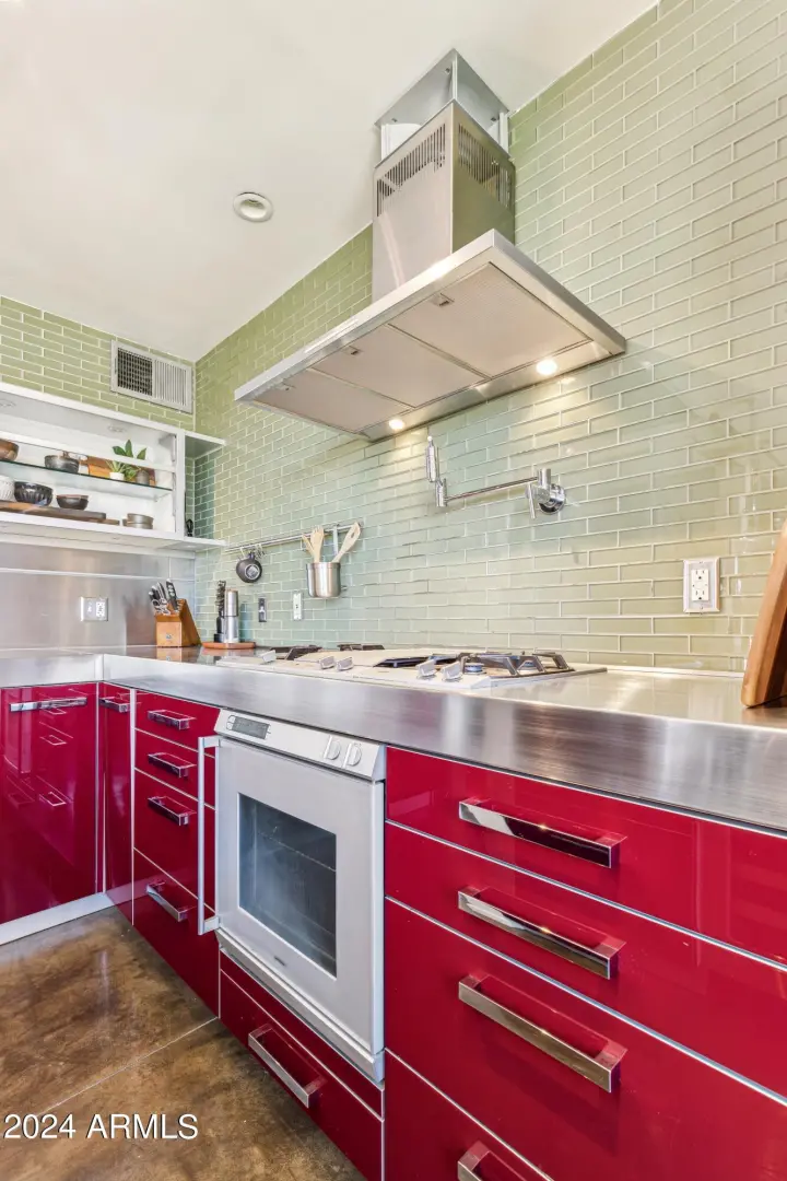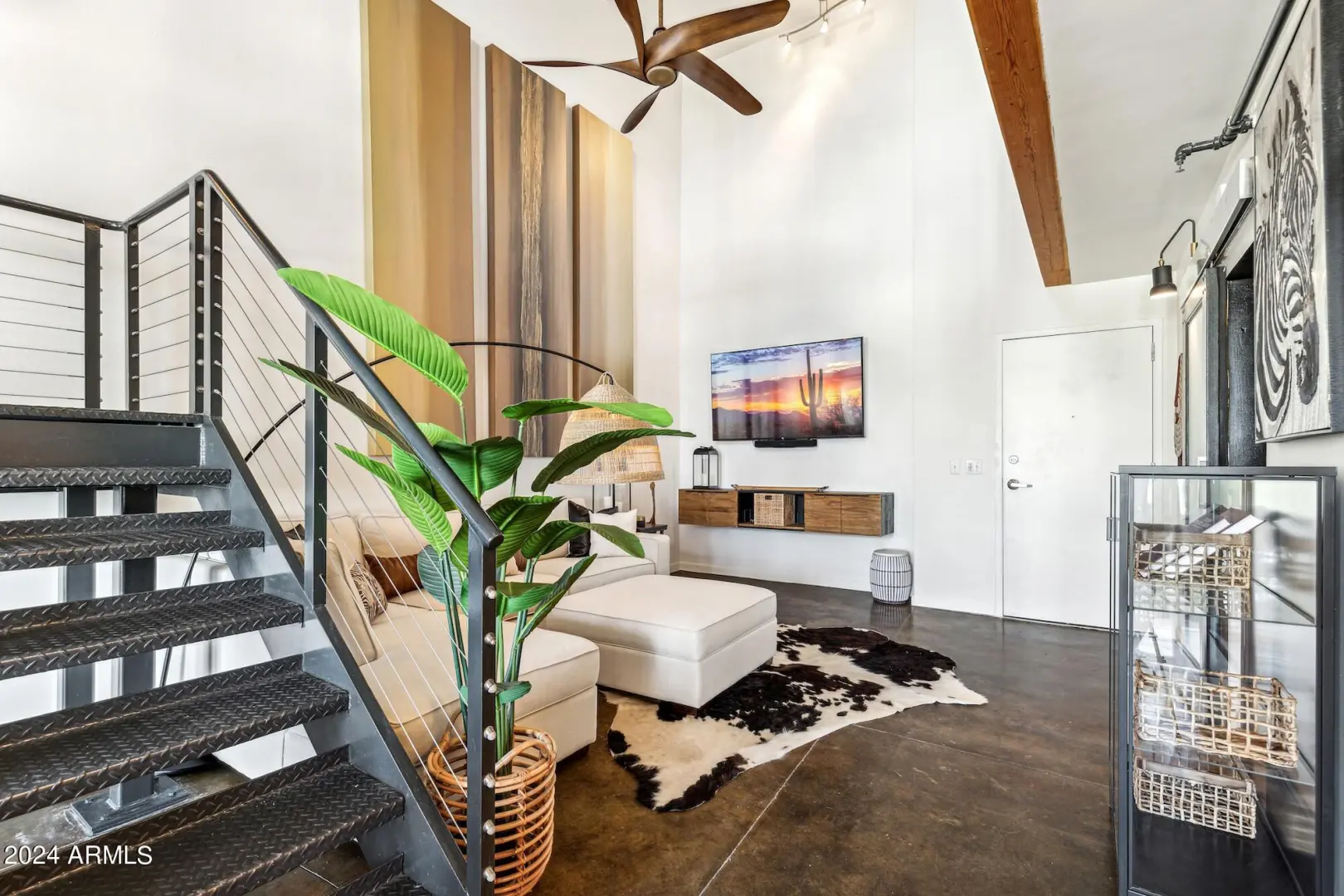 Price reflects a 12-month lease, please inquire about alternative pricing if desired length is more or less than 12 months. Prepare to be blown away as you step inside this incredible, multi-level loft that encompasses a chic modern/industrial charm around every corner. Polished concrete floors, soaring ceilings and a bold black metal staircase are just a few of the standout features in this property. The living area includes a built-in Sonos system as well as a beautiful custom art piece that truly accentuates the space. The European style kitchen has Gaggenau stainless steel appliances (with a built-in grill) and sleek red cabinetry. The adjacent dining area, with its modern lighting from Crate and Barrel, offers expansive west-facing views—perfect for watching the sunset.
