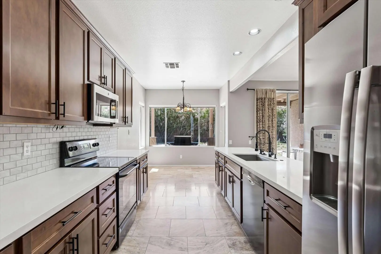 Beautiful 4-bedroom, 2-bath rental with a private pool in a desirable neighborhood. This well-maintained home features a bright, open layout with neutral finishes and plenty of natural light throughout. The kitchen offers quartz countertops, stainless steel appliances, ample cabinet space, and opens to the main living areasperfect for everyday living and entertaining. Spacious primary suite includes dual sinks, a walk-in shower, and soaking tub. Additional bedrooms provide flexibility for guests, home office, or extra living space. Enjoy Arizona living in the backyard with a sparkling pool, covered patio, and low-maintenance desert landscaping. Conveniently located near shopping, dining, and freeway access.