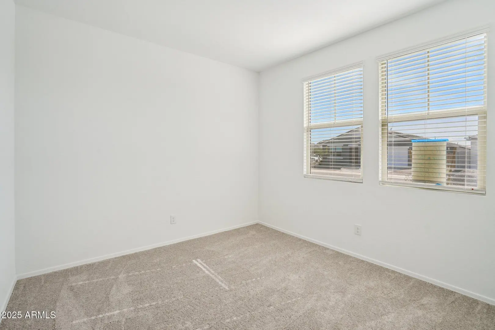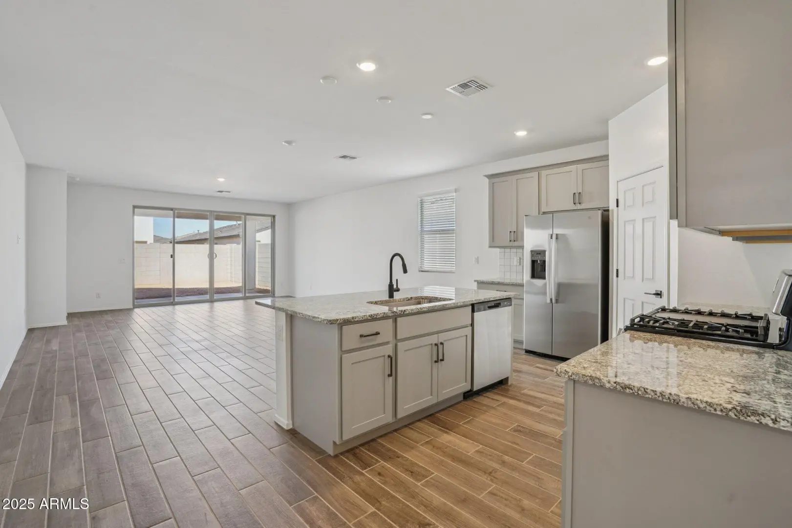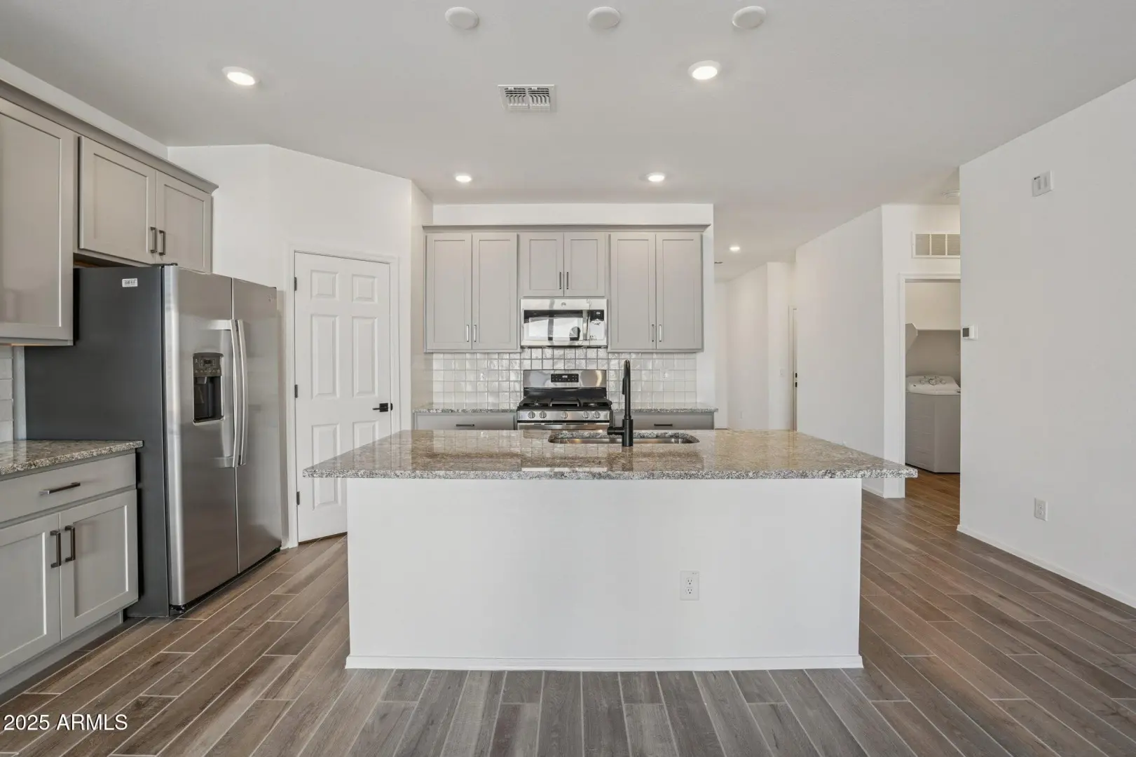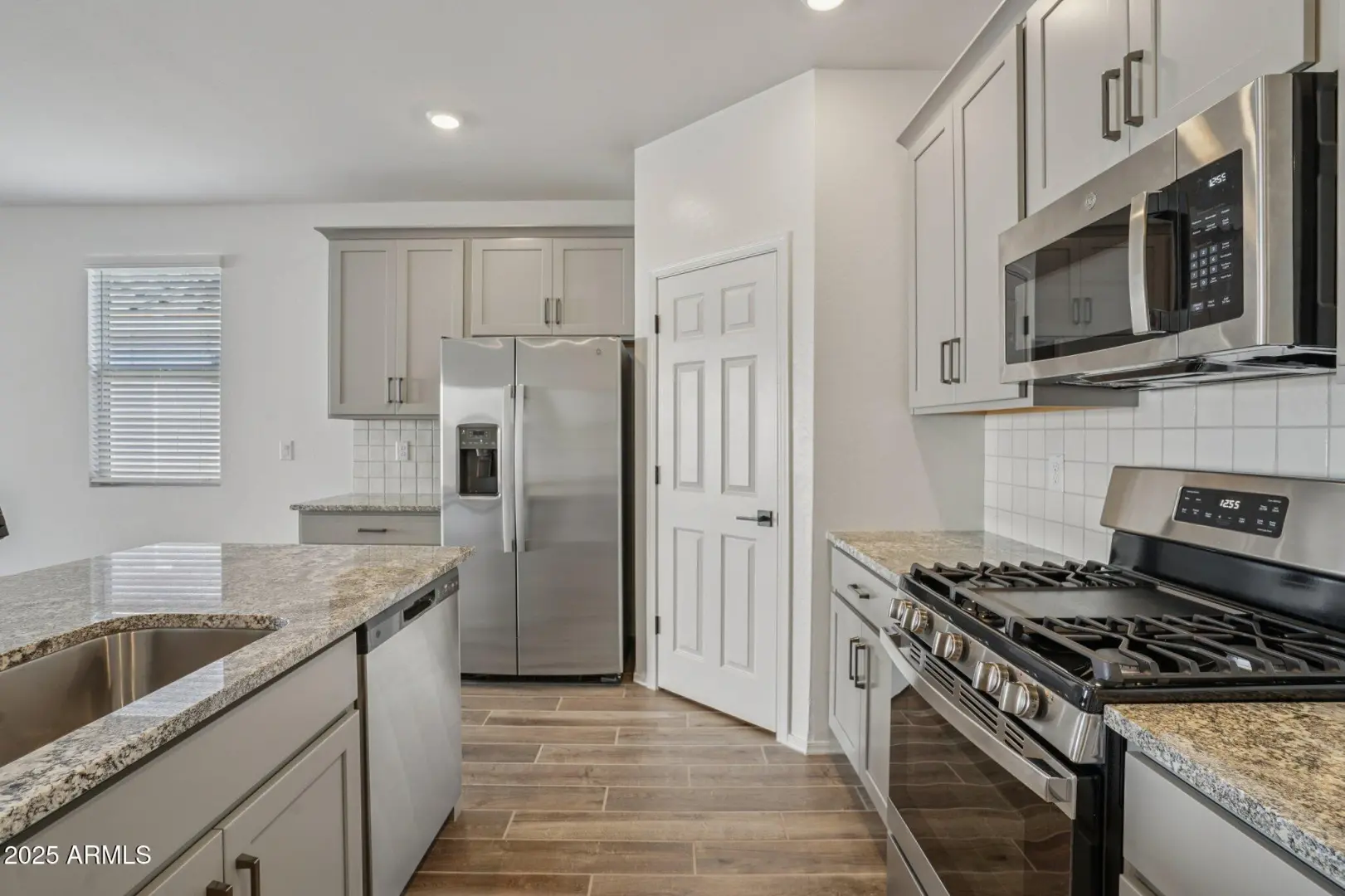 Welcome to the Sunflower! Boasting 2,219 sq ft, 4 bedrooms, 3 baths; this home offers a versatile floor plan perfect for any buyer. Enjoy 9 ft ceilings, wood-look tile in main areas, carpet in bedrooms, and 2.5 car garage. The spacious kitchen features the Artisan Collection with 42'' upper soft grey cabinets, granite countertops, tiled backsplash, and hardware. The great room has a 4-panel glass slider that opens to a covered patio. The guest retreat can be a mother-in-law suite, office, or additional living area. GE washer/dryer, fridge, and blinds also included! The Amarillo Creek community offers parks, pickleball court, basketball, and is conveniently located near Route 347 for easy commuting to Phoenix. Minutes from dining, shopping, and all the entertainment that Maricopa has