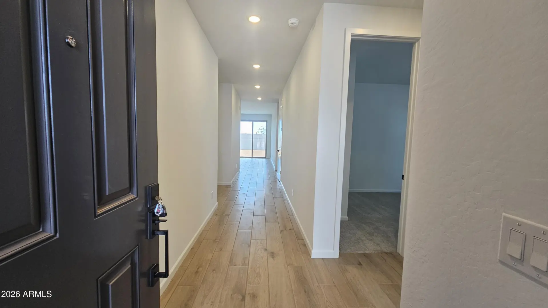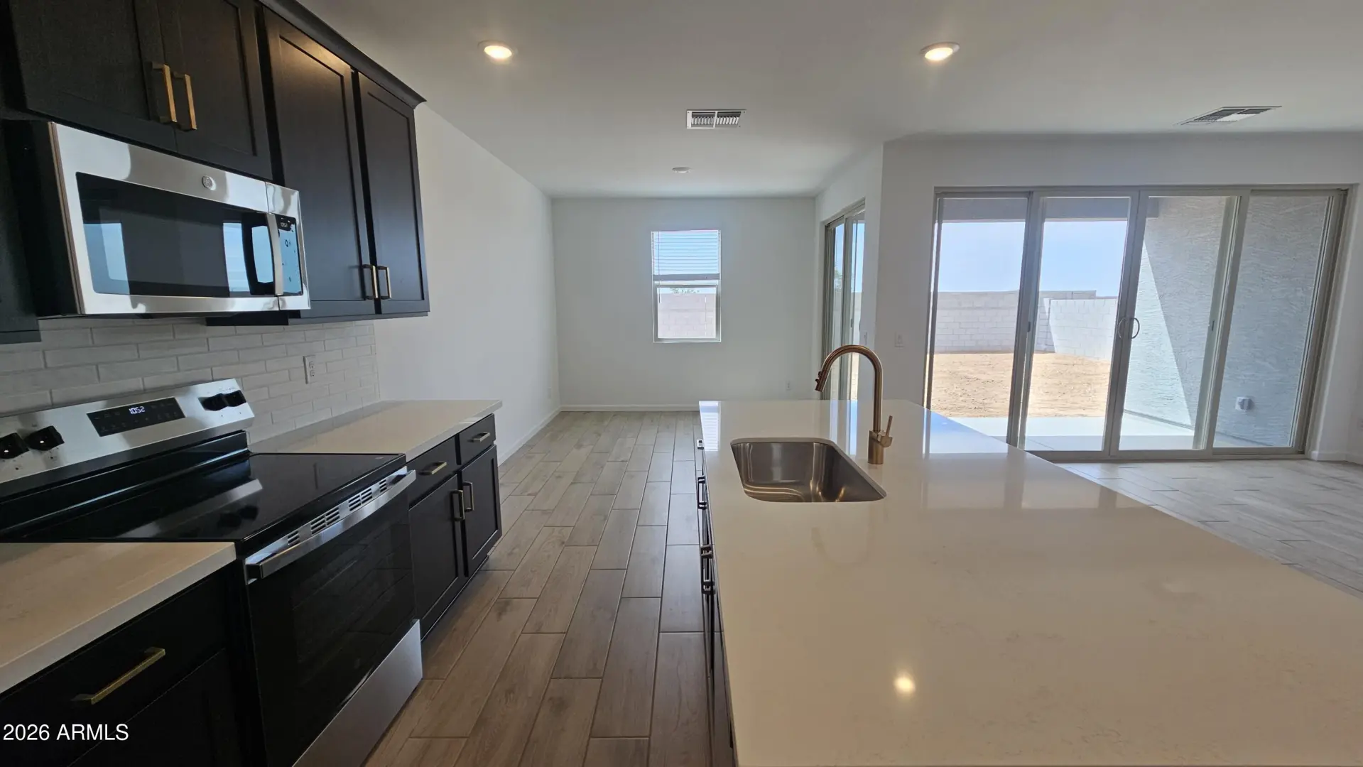 Welcome to the Larkspur at Skyline! This 1,950 sq ft single-story home features 3 bedrooms, 2 bathrooms, a flexible den, and a 2-car garage with a stylish Desert Modern-style exterior. The Oxford Collection offers a modern look with espresso cabinetry, quartz countertops, gold cabinet pulls, and wood-look tile in all main areas. A 12' sliding glass door brings in natural light and opens to the backyard for seamless indoor-outdoor living. Enjoy 8' interior doors, blinds, stainless steel appliances, refrigerator, washer, dryer, and a soft water loop. Located in Skyline with amenities including a pool, splash pad, pickleball, basketball, volleyball, walking trails, fitness center, tot lots, and a community clubhouse with kitchen. Enjoy the good life!