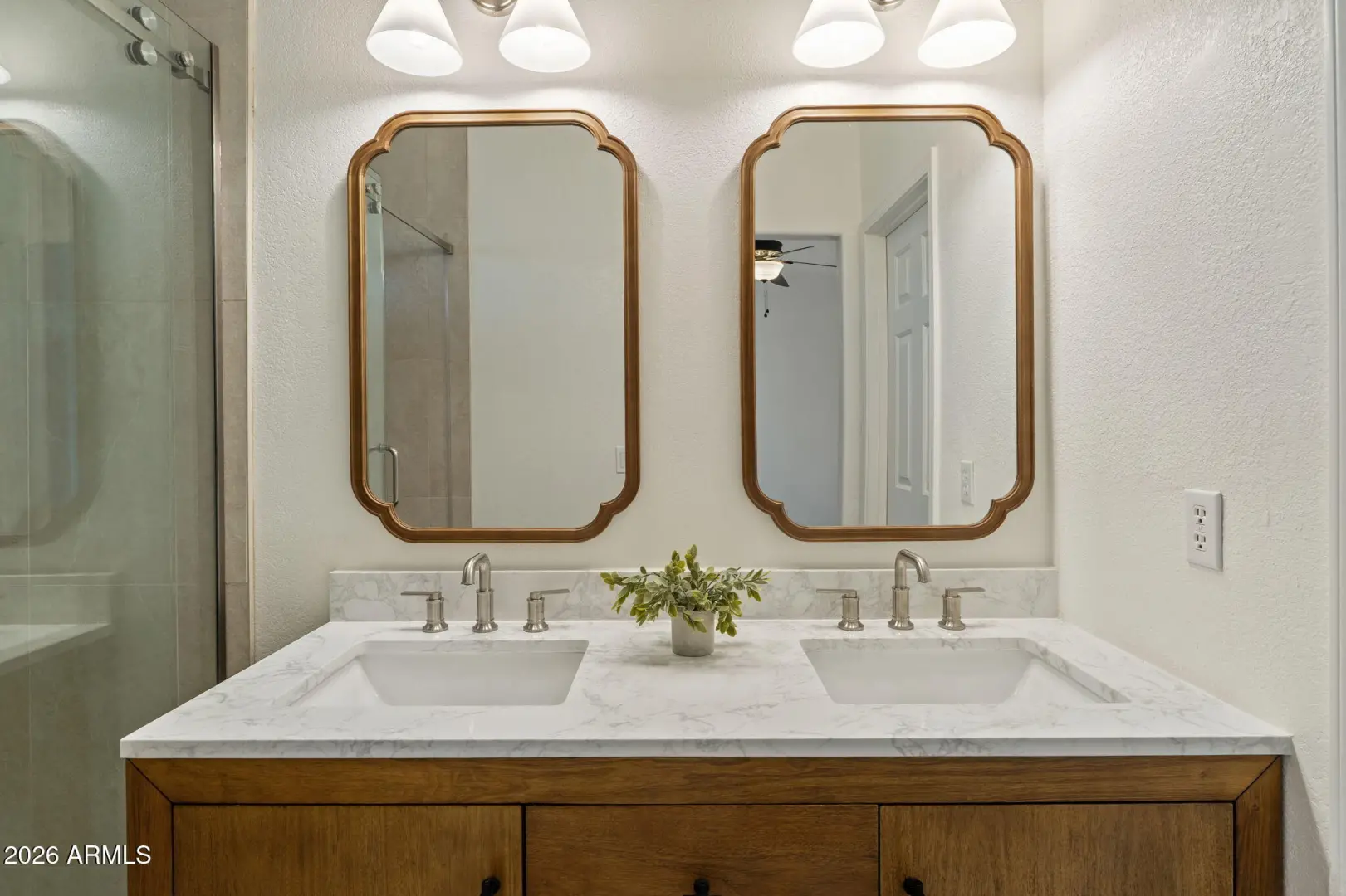 Wake up where emerald fairways meet desert skies. Set against the dramatic backdrop of South Mountain, this beautifully reimagined residence delivers unobstructed golf views within the coveted Legacy Golf Resort. Inside, the home has undergone a near $100,000 renovation in 2025, delivering a clean, modern aesthetic designed. The all-new kitchen anchors the space with custom cabinetry, a striking oversized island, and quartz countertops, complemented by Frigidaire Professional Series appliances. New luxury vinyl plank flooring flows throughout, paired with fresh baseboards, updated lighting, and dual-pane windows that flood the home with natural light. Both bathrooms have been fully transformed with contemporary finishes and thoughtful upgrades like custom laundry shelving. GATE CODE #6869